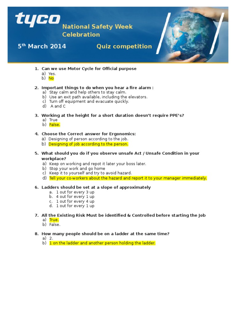 Multiple Choice Quiz Hazards And Risk Multiple Choice Quiz Hazards And Risks Please Complete The Studocu from d20ohkaloyme4g.cloudfront.net Comply with health and safety law b. More coming soon… list of quizzes: Satisfy the enforcement officer c. Having fun in the workplace keep your office relaxed which will result in increased productivity as employees continue to enjoy their job. This safety trivia questions and answers, as one of the most committed sellers here will enormously be accompanied by the best options to review. Bookmark file pdf safety trivia questions and answers questions and answers that we will enormously offer. Our books collection spans in multiple locations, allowing you to get the most less latency time to download any of our books like this one. Fall protection food safety …